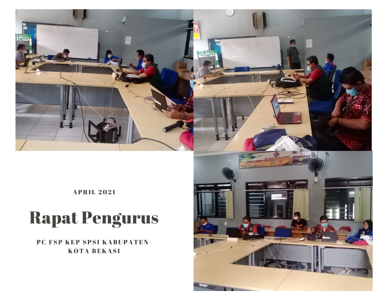 PC FSP KEP SPSI Kabupaten-Kota Bekasi menyelenggarakan Rapat pengurus Bulanan pada hari ini Jum’at 23 April 2021, bertempat di Aula DPC KSPSI. hal yang menjadi topik utama tentu membahas program yang berkaitan dengan menghadapi tantangan pasca diundangkannya UU cipta Kerja yang mengancam Pekerja/Buruh dan juga Serikat Pekerja/Buruh. Semua Bidang yang ada di kepengurusan PC FSP KEP SPSI Kabupaten-Kota Bekasi yaitu Bidang Organisasi dan Pendidikan, Bidang Advokasi dan Pembelaan, Bidang Sosial Kesejahteraan, Bidang Pengembangan, Soliditas dan Solidaritas, Bidang Propaganda dan penguatan jaringan, bidang Keuangan dan kesekretariatan.