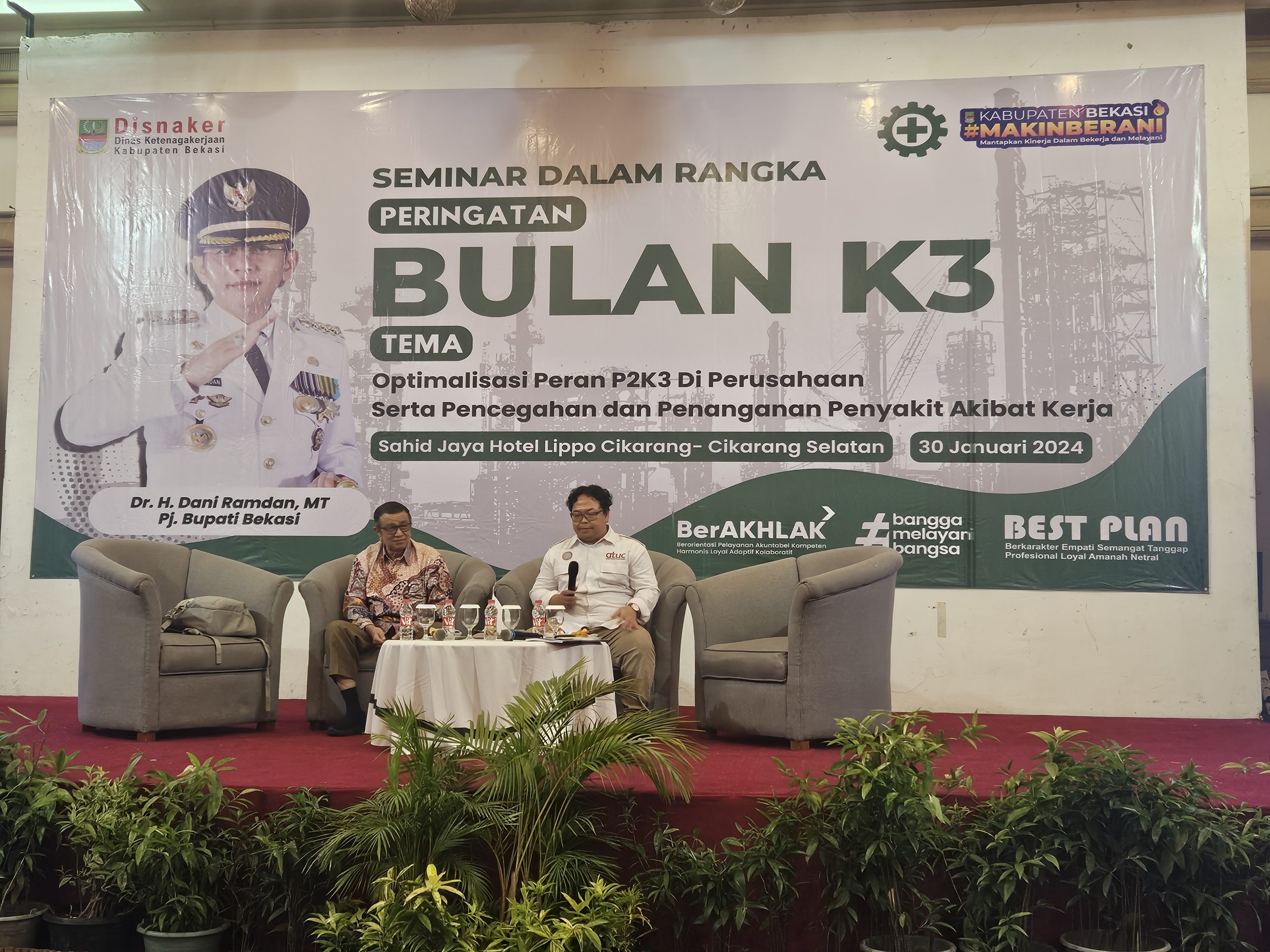 Cikarang Selatan, spsibekasi.org – 30 Januari 2024, Dinas Ketenagakerjaan (DISNAKER) Kabupaten Bekasi menggelar seminar dalam rangka memperingati Bulan Keselamatan dan Kesehatan Kerja (K3). Acara ini bertempat di Hotel Sahid Jaya, Lippo Cikarang, Kabupaten Bekasi, dan mengusung tema “Optimalisasi Peran P2K3 di Perusahaan serta Pencegahan dan Penanganan Penyakit Akibat Kerja.”