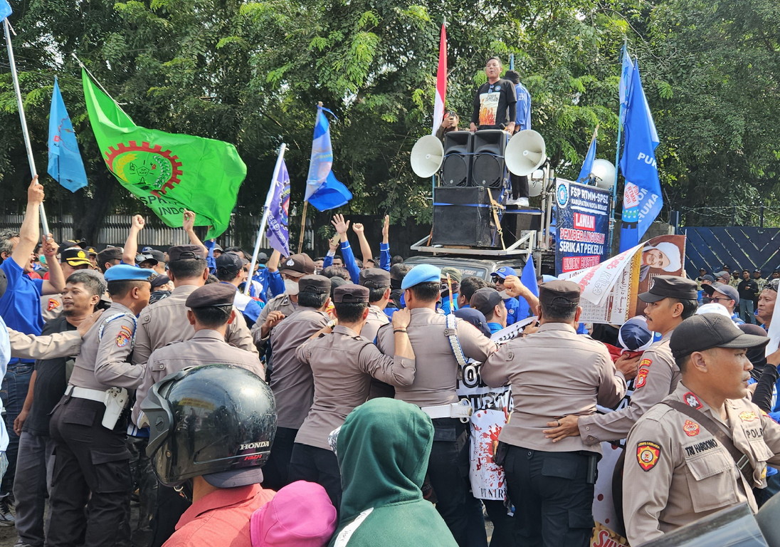 Suasana aksi semakin bersemangat dengan lantunan lagu-lagu perjuangan dan orasi dari berbagai pimpinan serikat pekerja. Salah satu orator, Sri Retno Purwaningsih dari PC FSP KEP SPSI Kabupaten-kota Bekasi, menegaskan pentingnya perusahaan mematuhi ketentuan hukum dalam setiap tindakan ketenagakerjaan.