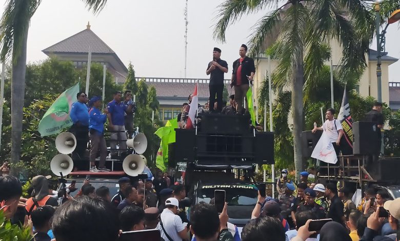 Bekasi, spsibekasi.org – Ribuan buruh yang tergabung dalam Aliansi Buruh Bekasi Melawan (BBM) dan Persatuan Pekerja dan Rakyat (PERAK) Bekasi menggelar aksi unjuk rasa di Kabupaten Bekasi pada Kamis (25/9). Menyikapi aspirasi yang disampaikan para pekerja, Bupati Bekasi Ade Kuswara Kunang didampingi Wakil Bupati Asep Surya Atmaja dan Anggota DPRD Kabupaten Bekasi, Surohman, hadir langsung memberikan pernyataan dari atas mobil komando di tengah massa aksi.