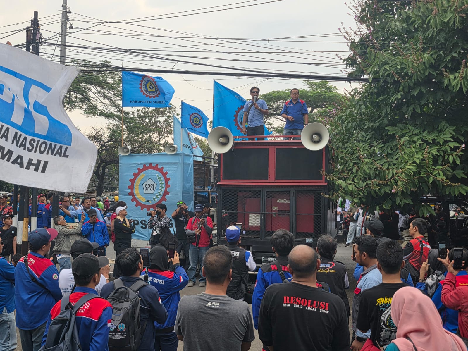“Yang kami tuntut jelas Gubernur harus patuh pada Peraturan Pemerintah Nomor 49 Tahun 2025. UMSK wajib ditetapkan berdasarkan rekomendasi Bupati/Wali Kota, bukan hasil kajian sepihak Disnakertrans Provinsi,” tegas perwakilan buruh di tengah aksi.
