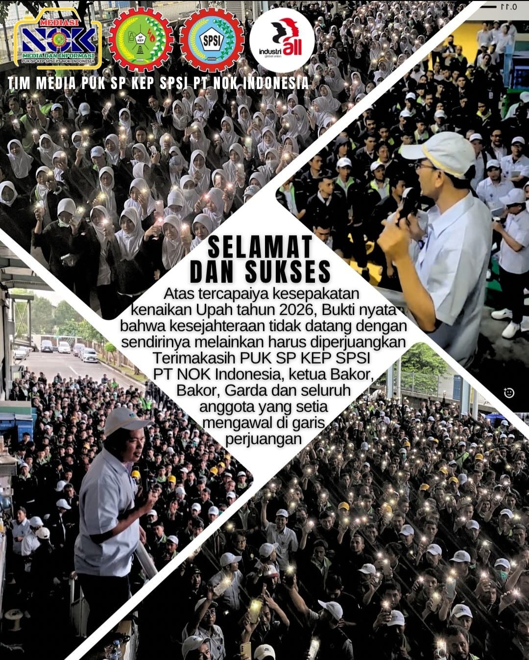Ketua PUK SP KEP SPSI PT NOK Indonesia, Edi Supriyanto, dalam penyampaian hasil perundingan kepada anggota yang selama ini aktif mengawal jalannya perundingan, menyampaikan apresiasi atas perjuangan dan solidaritas seluruh anggota. Ia menegaskan bahwa hasil yang dicapai merupakan buah dari konsistensi dan semangat juang bersama.