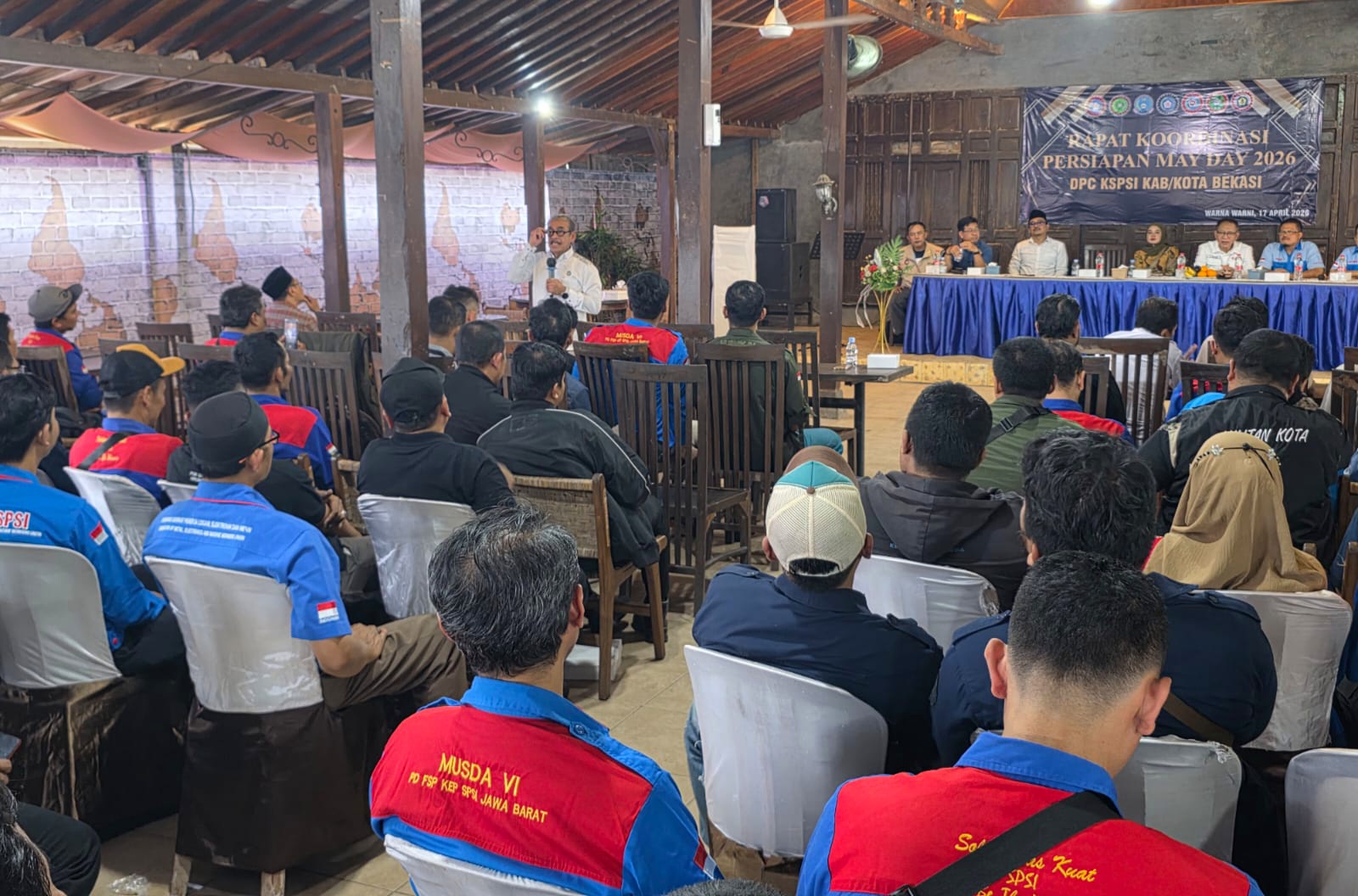 Bekasi — Dewan Pimpinan Cabang (DPC) KSPSI Kabupaten/Kota Bekasi menggelar rapat koordinasi persiapan peringatan May Day 2026 yang dirangkaikan dengan kegiatan halal bihalal pada Jumat (17/4/2026) di Warna Warni Resto, Jl. Inspeksi Kalimalang, Tambun, Bekasi. Kegiatan ini dihadiri sekitar 150 peserta yang merupakan perwakilan dari lima federasi serikat pekerja serta satu unsur non-sektor.
